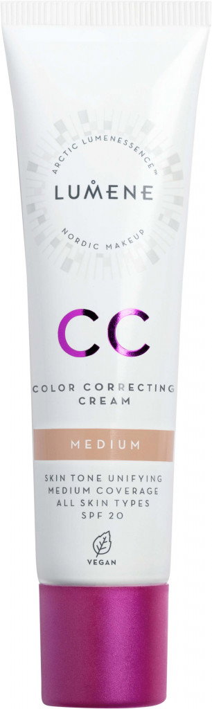 CC Color Correcting Cream är en lätt, medeltäckande flytande foundation som reducerar rodnad och jämnar ut huden så att den blir naturligt strålande. Sammansättningen är berikad med nordiska lingon som jämnar ut hudtonen och återfuktande nordiskt källvatten. Den fördelar sig jämnt och reducerar eventuella missfärgningar och rodnad för ett omedelbart utjämnat resultat. Den kliniskt testade återfuktande effekten varar i mer än 8 timmar*. Produkten hjälper till att skydda mot de skadliga effekterna av UVA och UVB-strålning (SPF 20). Passar alla hudtyper. Finns i sex vackra nyanser. Produkten har utvecklats och tillverkats i Esbo, Finland och är vegansk.
